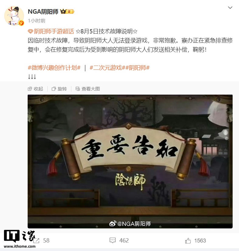 《阴阳师》官方则称:因临时技术故障,导致阴阳师大人无法登录游戏,非常抱歉。寮办正在紧急排查修复中,会在修复完成后为受到影响的阴阳师大人们发送相关补偿,鞠躬!