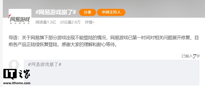 IT之家 8 月 5 日消息,网易旗下多款手游今日上午出现无法登录的问题,“网易游戏崩了”话题也冲上微博热搜。