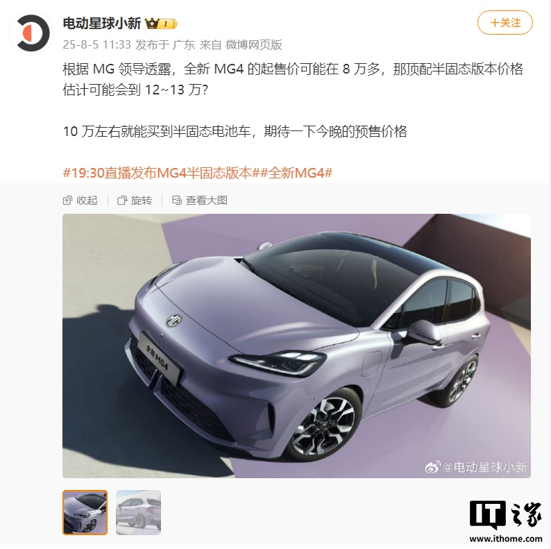 根据 MG 领导透露,全新 MG4 的起售价可能在 8 万多,那顶配半固态版本价格估计可能会到 12~13 万?
