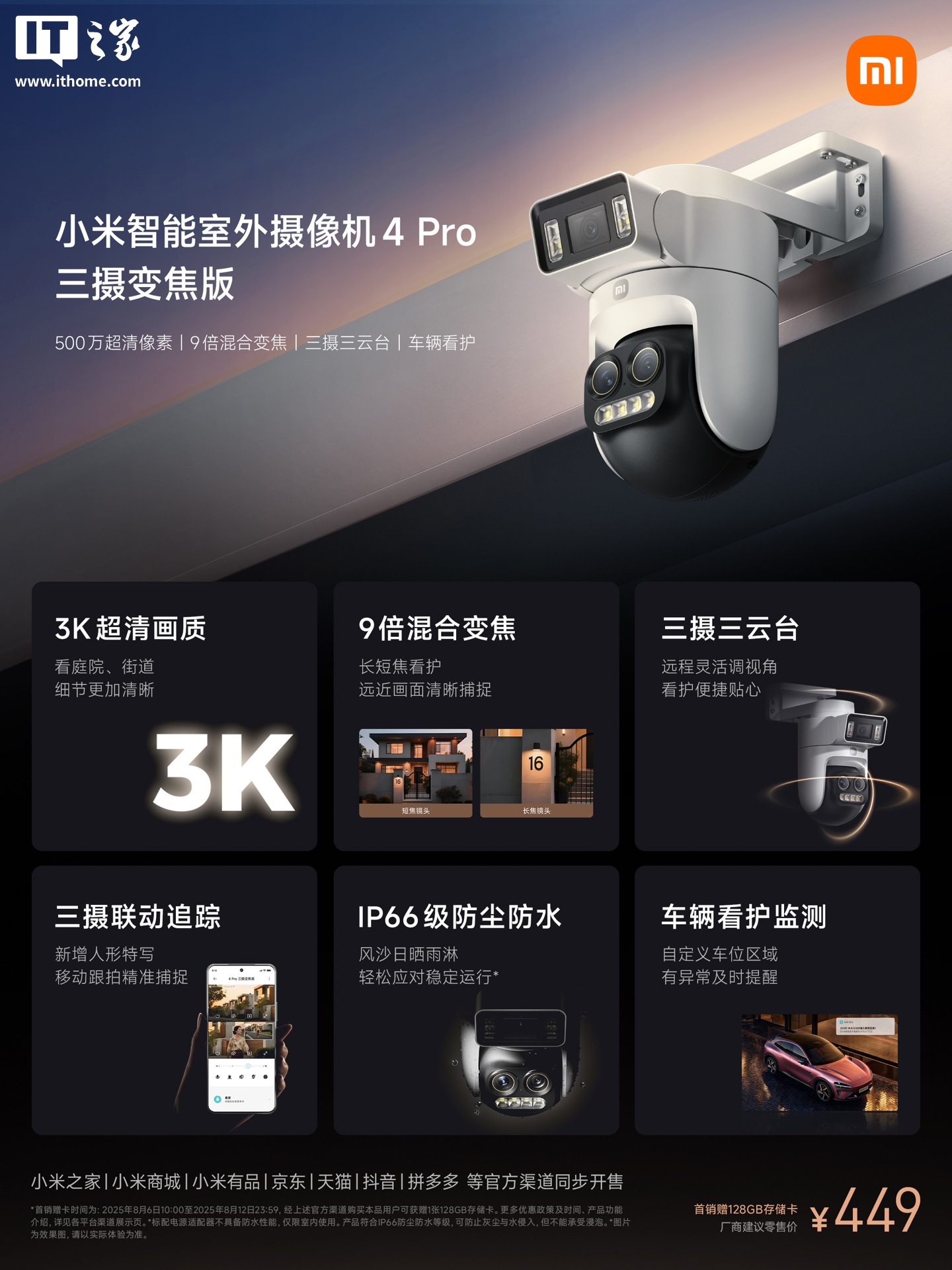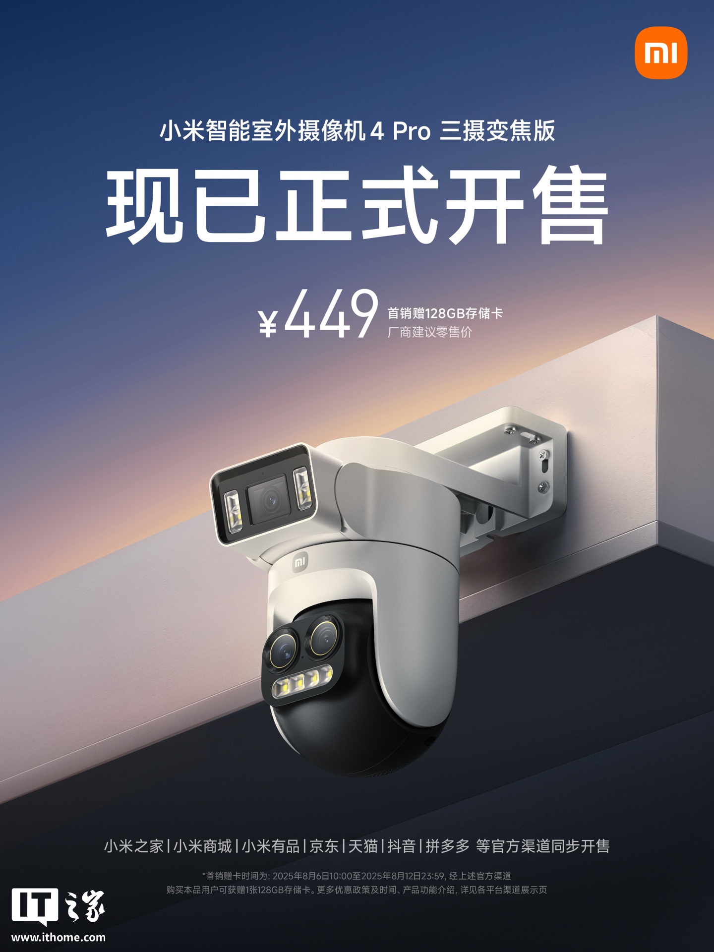IT之家 8 月 6 日消息,小米智能室外摄像机 4 Pro 三摄变焦版今日开售,拥有三摄三云台、9 倍混合变焦、三摄联动追踪,售价 449 元。