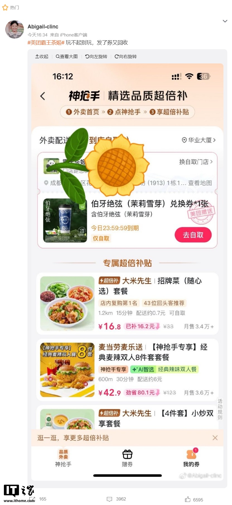 IT之家 8 月 6 日消息,“美团 霸王茶姬”话题今晚登上微博热搜,原因是有大量网友称通过美团“神抢手”活动领取的霸王茶姬“伯牙绝弦”兑换券,在短时间内被系统强制收回