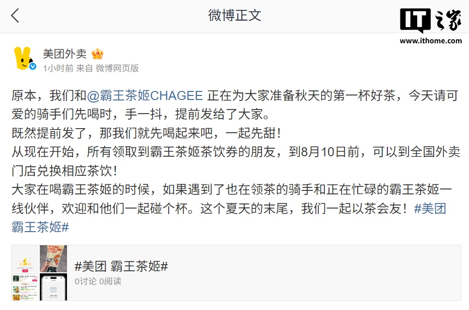 对此,美团外卖在官方微博回应称:“原本,我们和霸王茶姬正在为大家准备秋天的第一杯好茶,今天请可爱的骑手们先喝时,手一抖,提前发给了大家。既然提前发了,那我们就先喝起来吧。从现在开始,所有领取到霸王茶姬茶饮券的朋友,到 8 月 10 日前,可以到全国外卖门店兑换相应茶饮。”