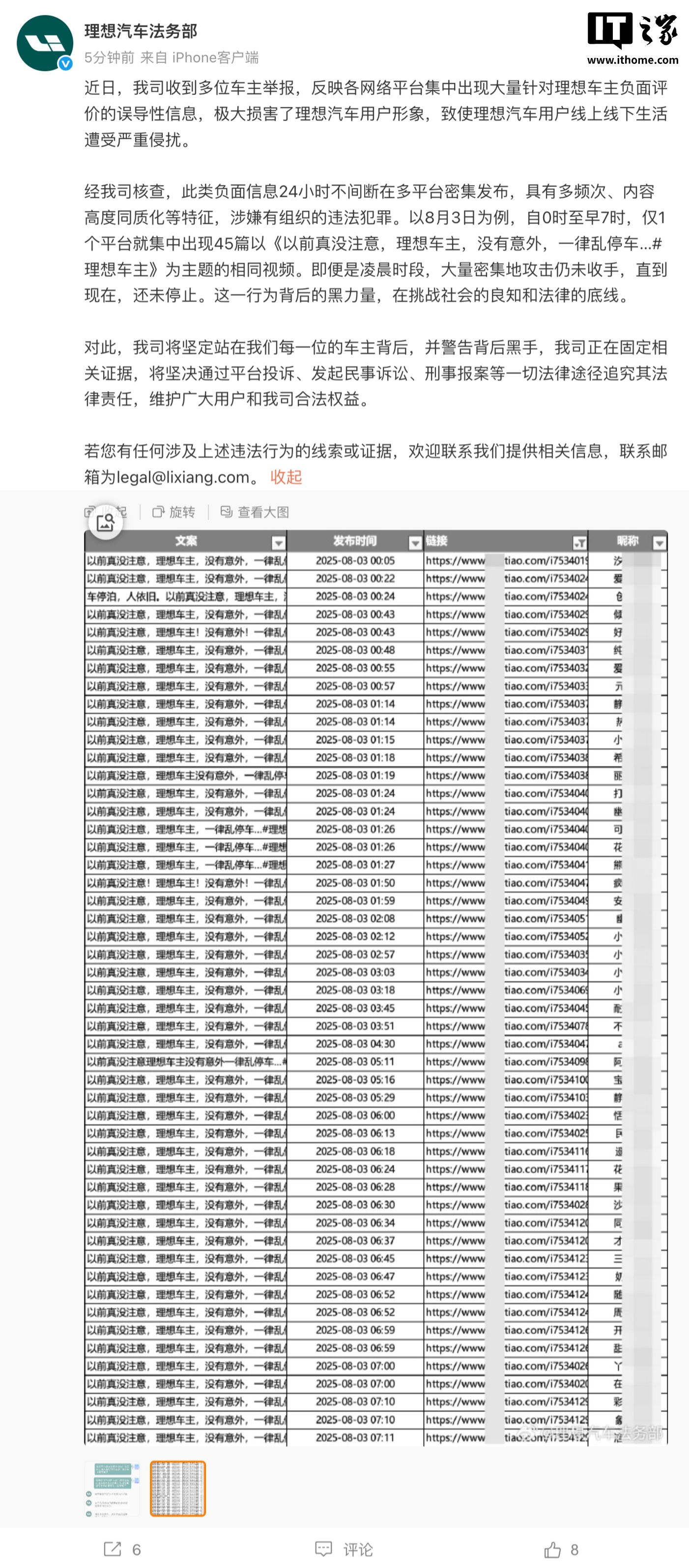 IT之家 8 月 7 日消息,理想汽车法务部官微今天上午发文称,近期收到多位车主举报,反映各网络平台集中出现大量针对理想车主负面评价的误导性信息,极大损害了理想汽车用户形象,致使理想汽车用户线上线下生活遭受严重侵扰。