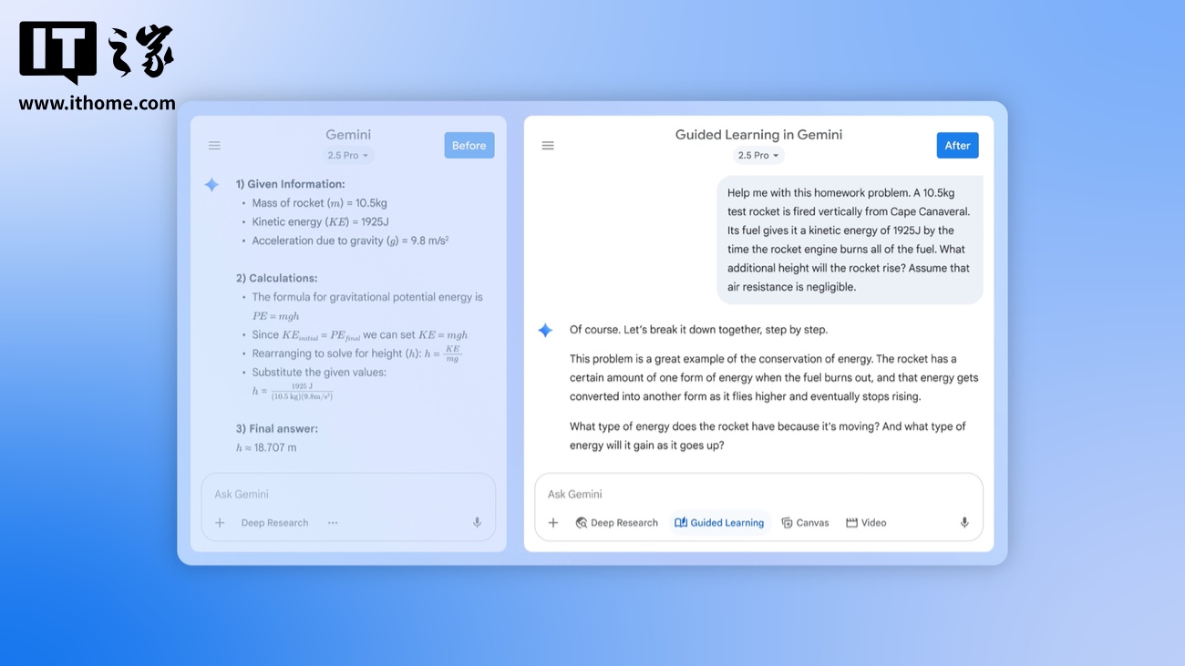 IT之家 8 月 7 日消息,谷歌的 Gemini AI 推出了一项名为“引导式学习”(Guided Learning)的新功能,旨在帮助用户真正理解他们所学习的问题,而不仅仅是直接给出答案。谷歌首席执行官桑达尔・皮查伊(Sundar Pichai)在其博客文章中表示,这种“引导式学习”模式充当了“学习伴侣”,通过“提问和逐步指导”来引导用户。