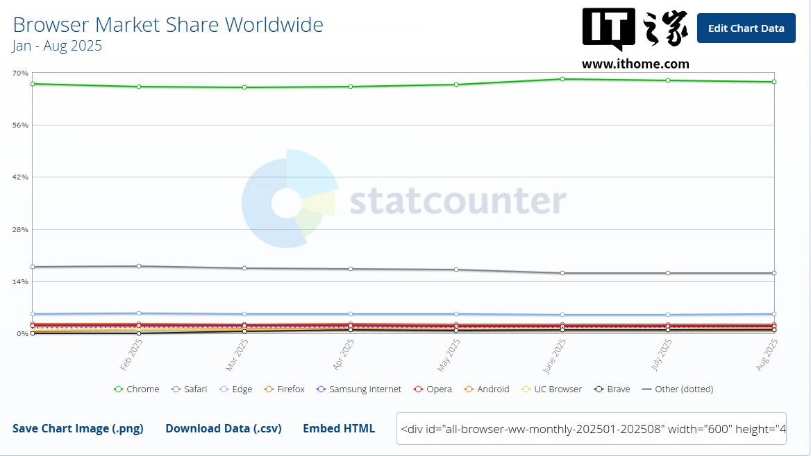 IT之家发稿前,查询 Statcounter 平台统计数据,目前 Firefox 浏览器的全球占比为 2.45%,而在 2025 年 1 月的占比为 2.54%,整体呈现不断下滑的趋势。