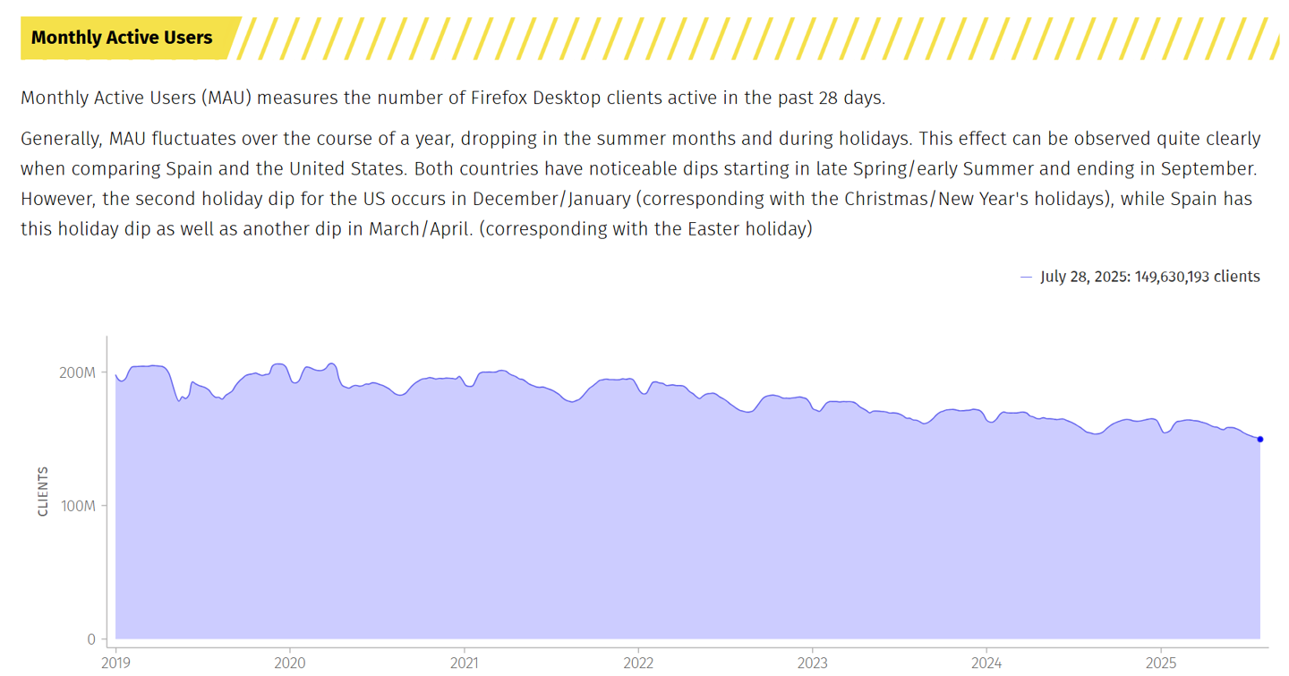 IT之家 8 月 7 日消息,根据官方统计数据,2025 年第 31 周(7 月 28 日周一开始计算),火狐 Firefox 浏览器的全球周活跃用户数量首次跌破 1.5 亿,活跃用户数据为 149630193。