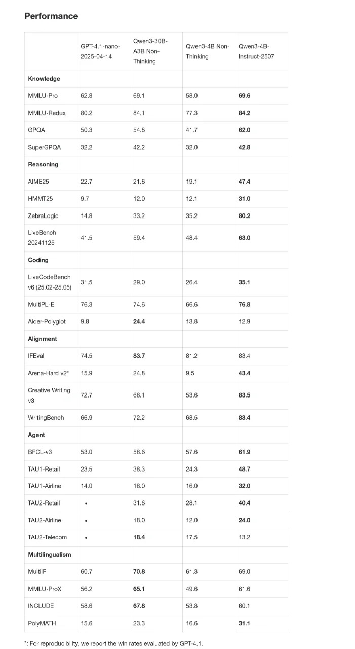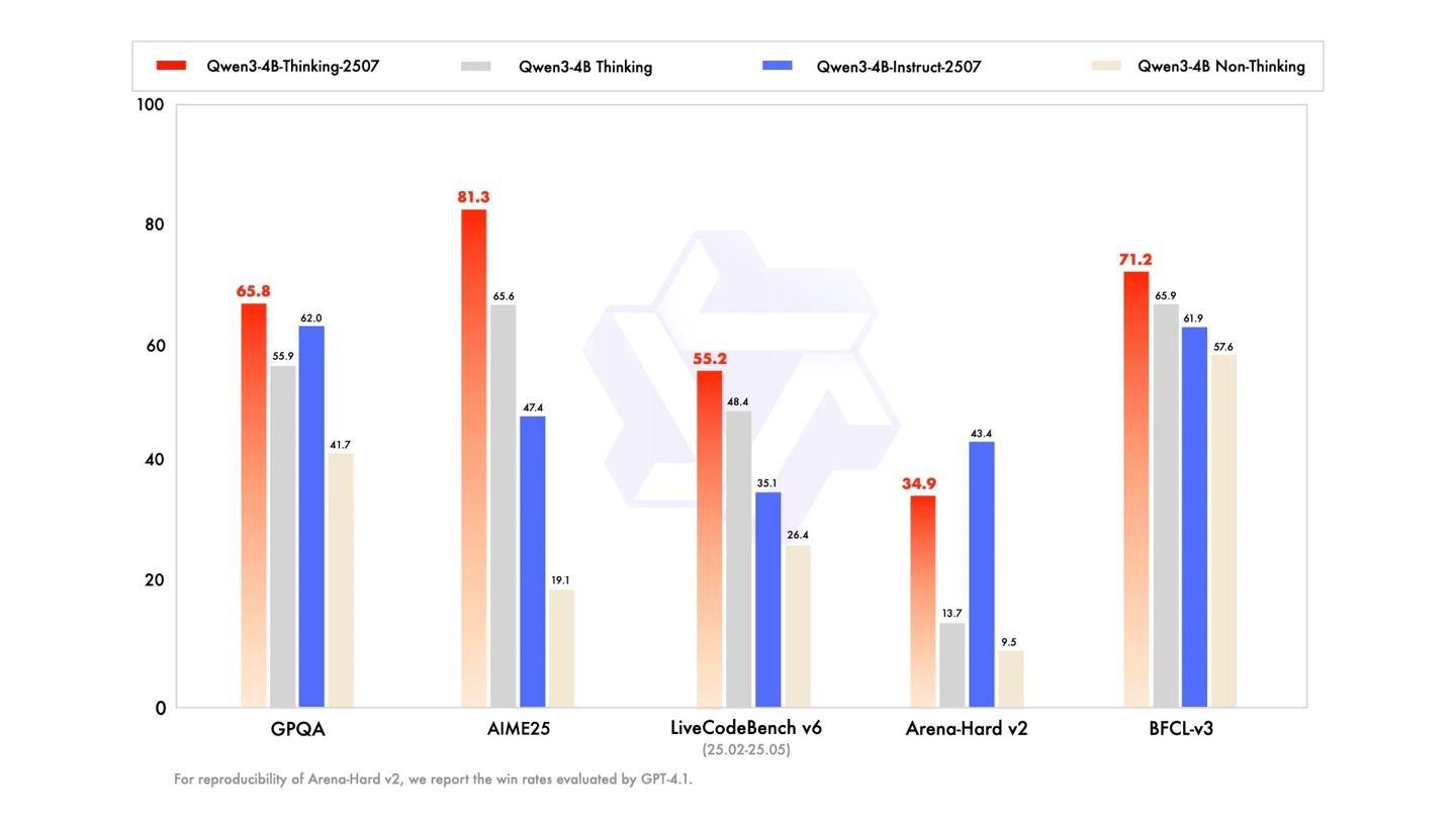 IT之家 8 月 7 日消息,通义千问 Qwen 昨日(8 月 6 日)发布公告,宣布,推出 Qwen3-4B-Instruct-2507 和 Qwen3-4B-Thinking-2507 两个模型,大幅提升性能。