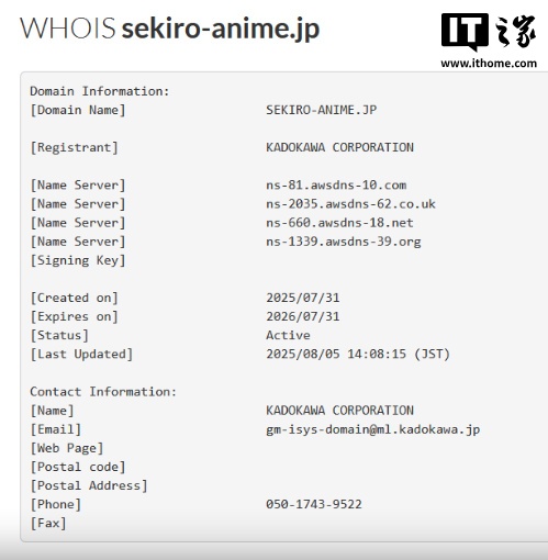 根据 EuroDNS 网站的信息,一个名为 sekiro-anime.jp 的域名已在 7 月 31 日被角川注册,角川是游戏开发商 FromSoftware 的母公司。