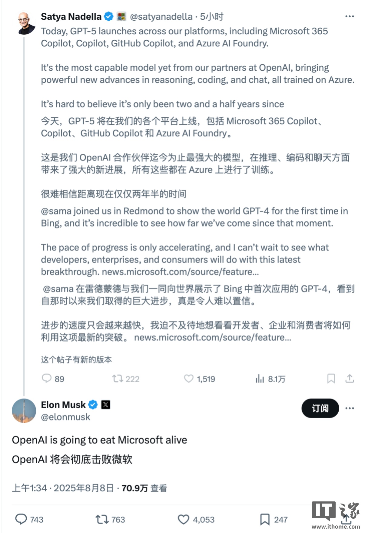 更甚者,马斯克还在微软 CEO 纳德拉的推文下面回复:OpenAI 将会“彻底击败微软”。
