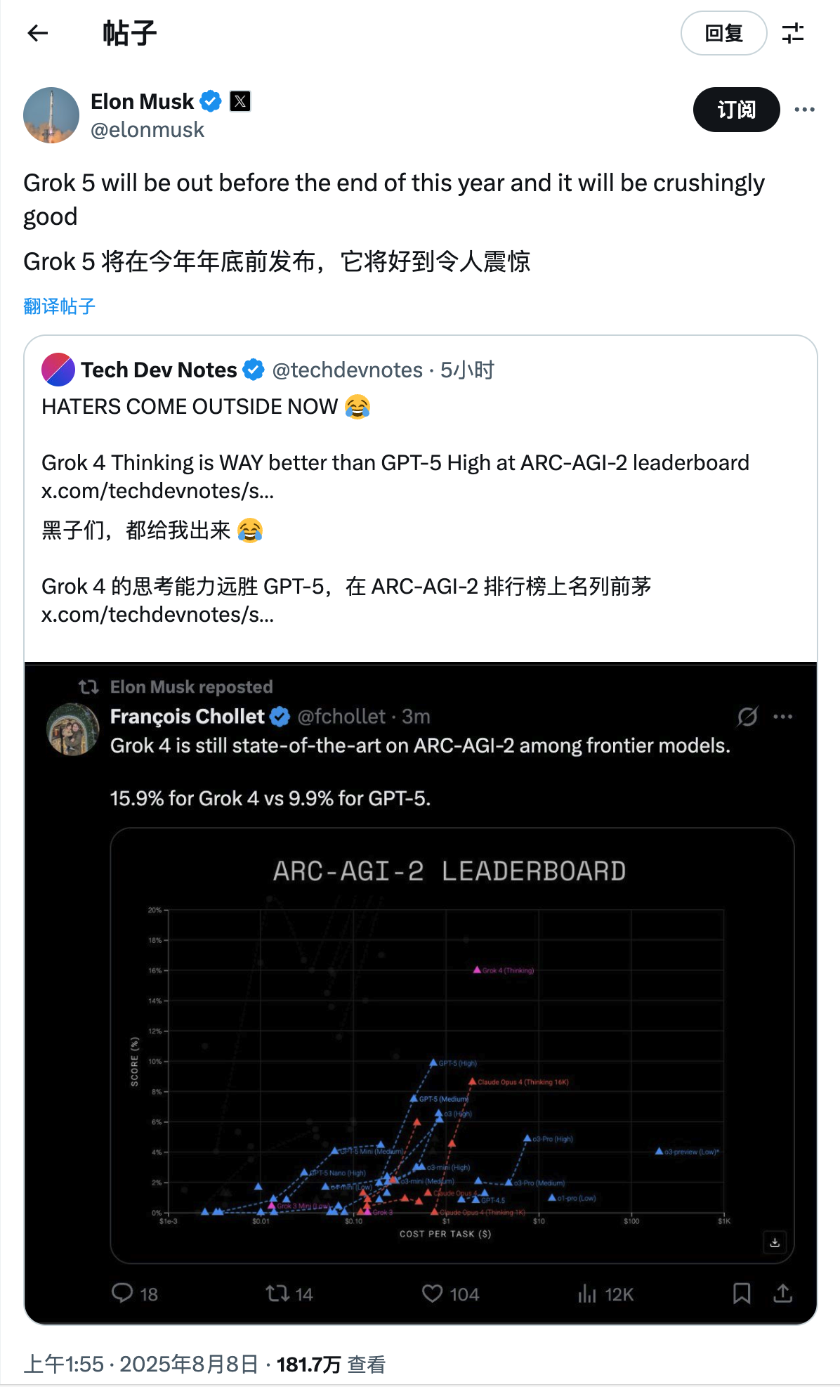 IT之家 8 月 8 日消息,xAI 联合创始人 YuhuaiWu 今天凌晨在 X 平台发文表示:“看到 GPT5 的发布,我为 @xai 感到非常自豪。我们以更小的团队,在很多方面都领先。Grok4 是世界上第一个统一模型,并在 ARC-AGI 等基准测试中击败了 GPT5。”