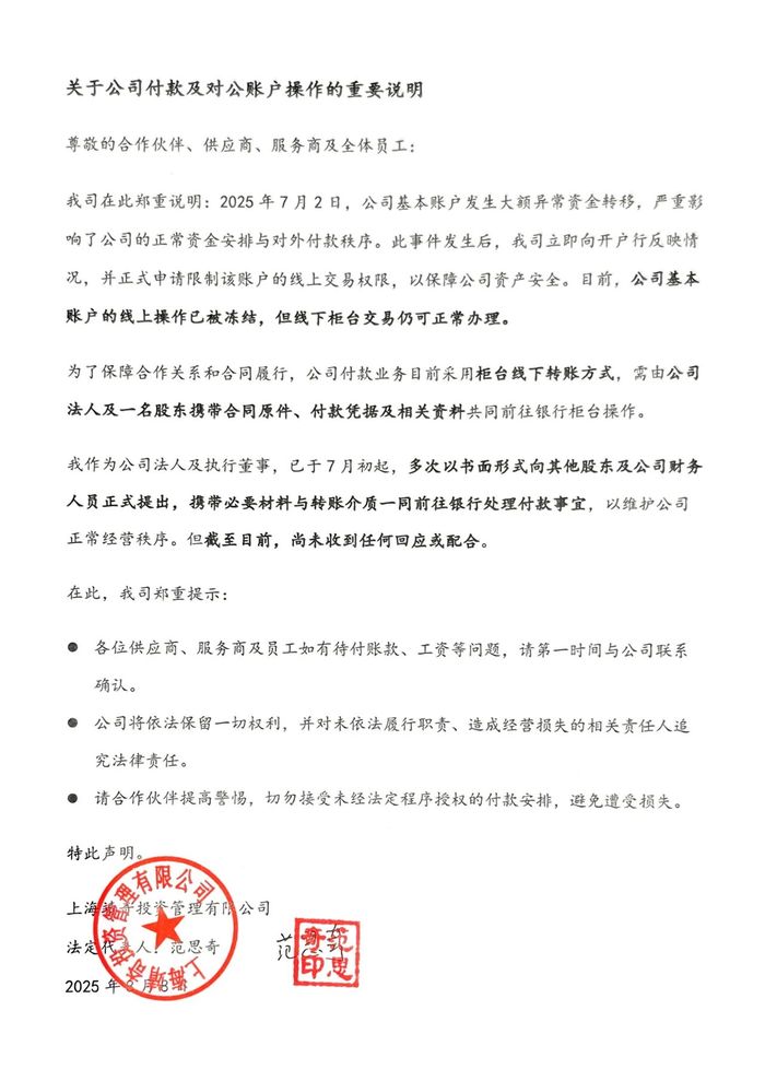 《声明》称,7月2日,公司基本账户发生大额异常资金转移,严重影响了公司的正常资金安排与对外付款秩序。此事件发生后,公司立即向开户行反映情况,并正式申请限制该账户的线上交易权限,以保障公司资产安全。目前,公司基本账户的线上操作已被冻结,但线下柜台交易仍可正常办理。